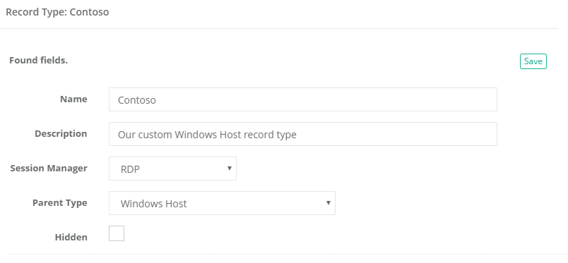 - If this Record Type will be used to create remote sessions, then select the protocol that will be used from the Session Manager dropdown. If it won’t be used for remote sessions, you may leave this selection empty or blank.