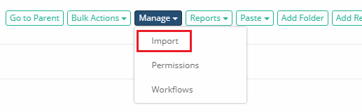 Navigate into the System folder (or vault) that will be the import location and select the Manage > Import option from this folder’s toolbar.
