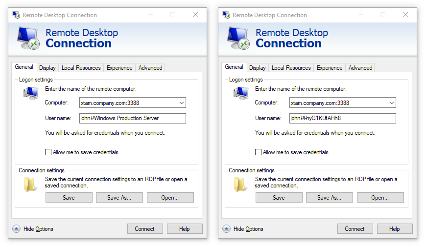 In the RDP client’s Username field, we will enter the string john#Windows Production Server or john# i-hyG1KUfAHh8 where john is our login name for PAM.