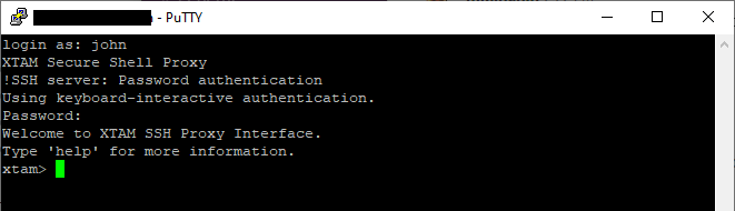 Once successfully connected, you will be greeted with the message Welcome to PAM SSH Proxy Interface and an xtam> prompt.