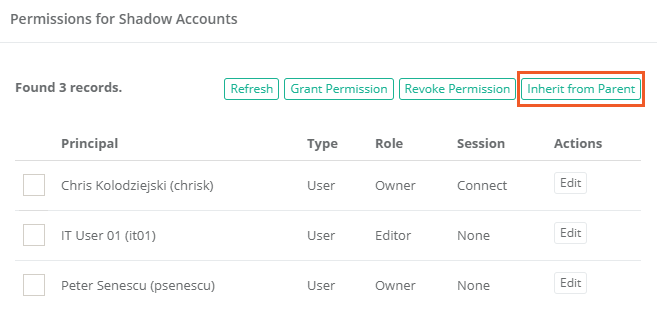 - The object’s permission will refresh and immediately display that it is now inheriting from its parent. All previously unique permissions and sharing on this object were revoked and those of its parent have been granted via inheritance.