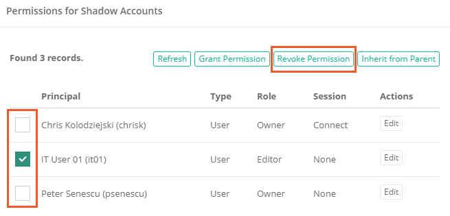 - Locate and select the Users or Groups whose permissions you wish to revoke and check the box next to their entry.