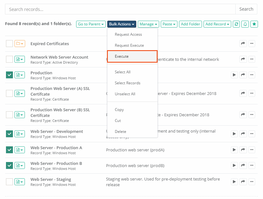 You can also execute this or any task against several records by simply selecting the checkbox option for the records in their folder location then choosing the Bulk Actions > Execute menu option.