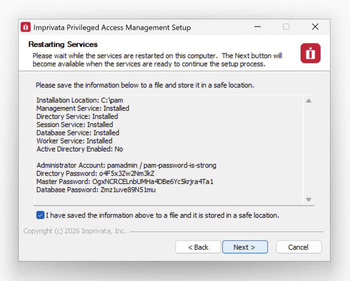 When the services are ready, check the box to confirm that your passwords have been saved to a file in a safe location and then the Next button will become available.