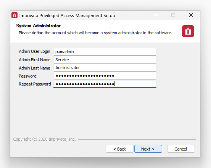 The account specified here may be used as the first System Administrator, so be sure to choose a memorable login (default login is “pamadmin”) with a strong password (maximum of 30 characters).